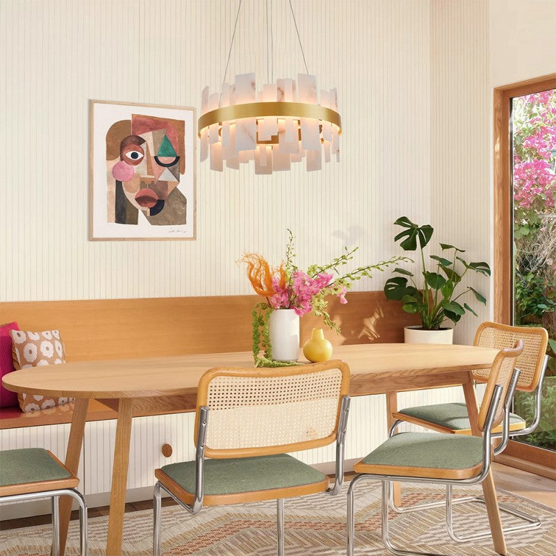 The Nocturne Alabaster Series features a sculptural halo of hand-cut Spanish alabaster panels, gently diffusing a soft, ambient glow. Its minimalist profile and warm luminosity make it ideal for dining rooms, living areas, or entryways, while the naturally veined stone ensures every fixture is uniquely beautiful. Designed for adjustable suspension and sloped-ceiling compatibility, it suits both modern and classic interiors.